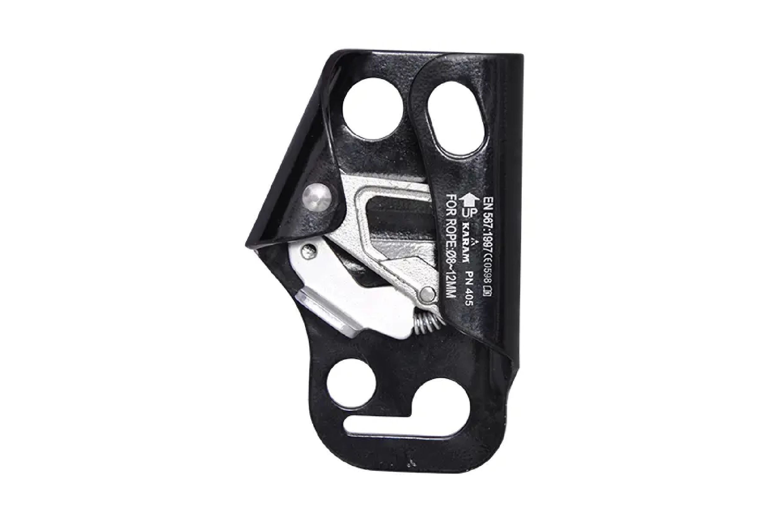 A climbing and rope access device designed to securely clamp onto a rope, providing a stable attachment point for the user. Typically used for controlled ascents and descents, it allows easy movement while offering firm grip and preventing slippage during work at height.